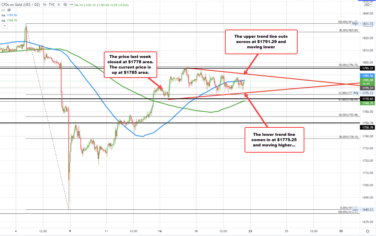 The current price is trading around $1785. That is in between a an upward sloping trendline cutting across at $1775.25 (and moving higher), and eight downward sloping trendline cutting across at $1791.29 (and moving lower). In between sets the 100 hour moving average. The price has been trading above and below that moving average of the last few days as traders consolidate and await the next shove.