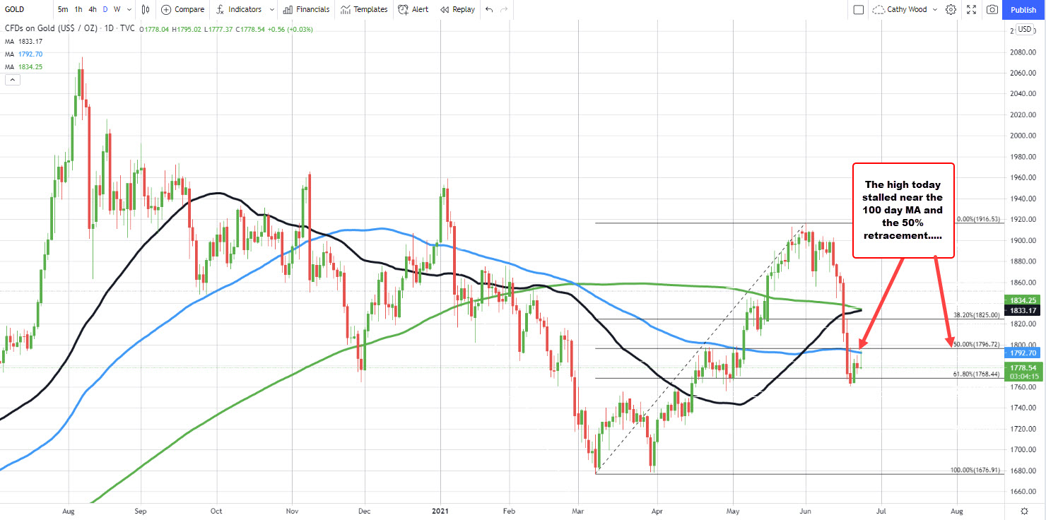 Looking at the daily chart, the high for the day stalled near its 100 day moving average of $1792.70. The 50% midpoint of the range since March comes in at $1796.72. Today’s high stalled between those two key technical levels.
