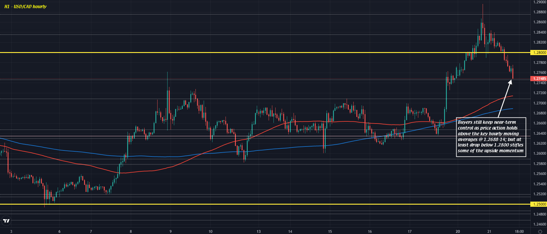 The drop back below 1.2800 sees the upside momentum stifled somewhat but price action holds above the key hourly moving averages and that continues to indicate that the near-term bias is still favouring buyers for the time being.