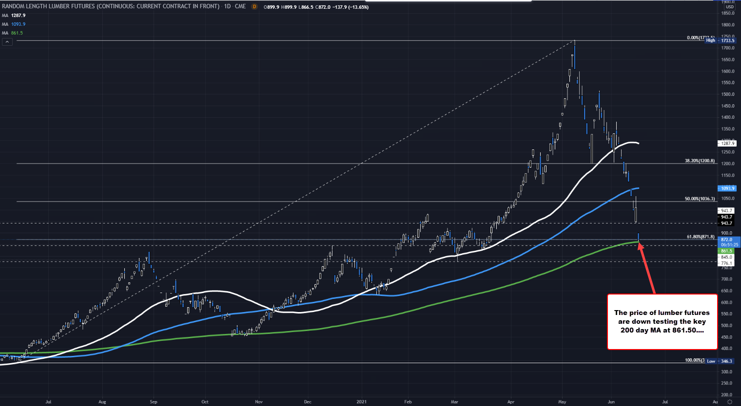 The price of lumber futures has continued its downward spiral as it moves below $900 for the first time since March 22 and tests its 200 day MA at $861.50.  The price high reached over $1733 on May 10. Since then, the price has moved down nearly 50% off that high.