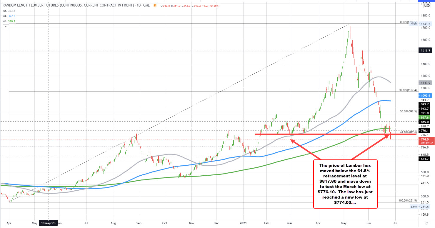 The low from early March at $776.10 has also just been broken with the price trading down to $774. That takes the price down to the lowest level since January 21.