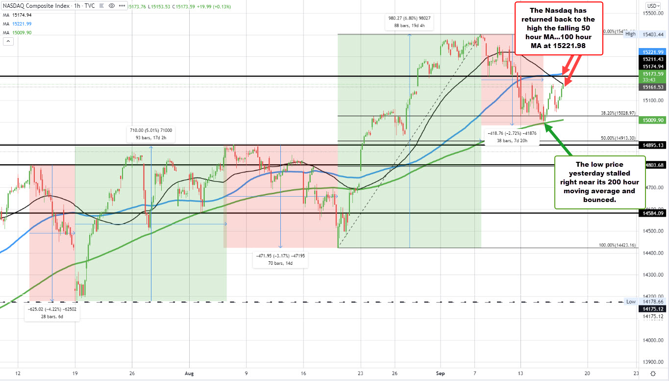 The price is currently testing its 50 hour moving average at 15174.94. Move above that level and the 100 hour moving average at 15221.99 will be targeted. Move above that moving average would open up the door for further upside momentum.
