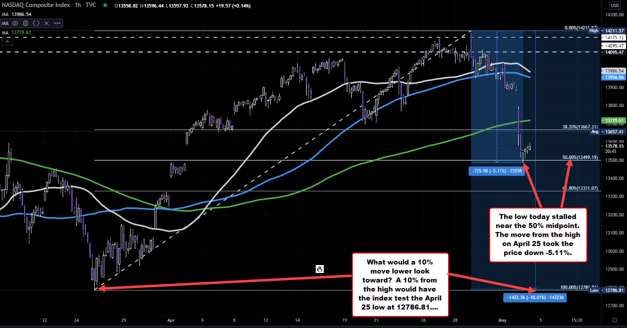 Looking at the correction off the high from April 29, the NASDAQ index has moved down 5.1% from the high to the low today. The price change moved down -726 points from a high of 14211.57 to the low today of 13485.59.