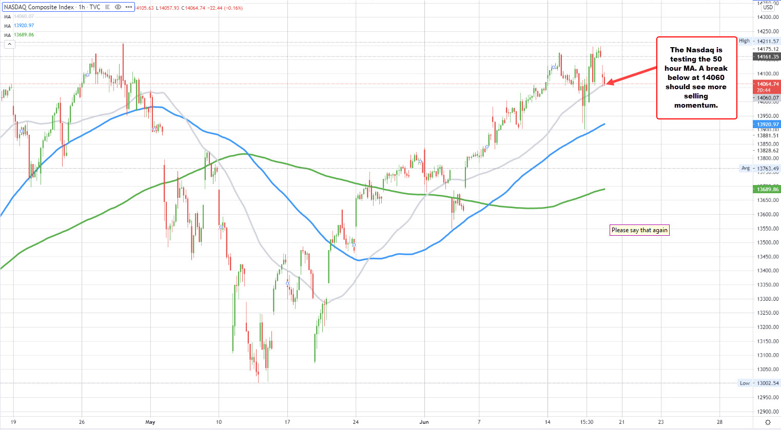 The Nasdaq index has moved back lower after a rebound from opening levels. The price is back down retesting the 50 hour MA at 14060 area. A move below that MA, should solicit more selling momentum.