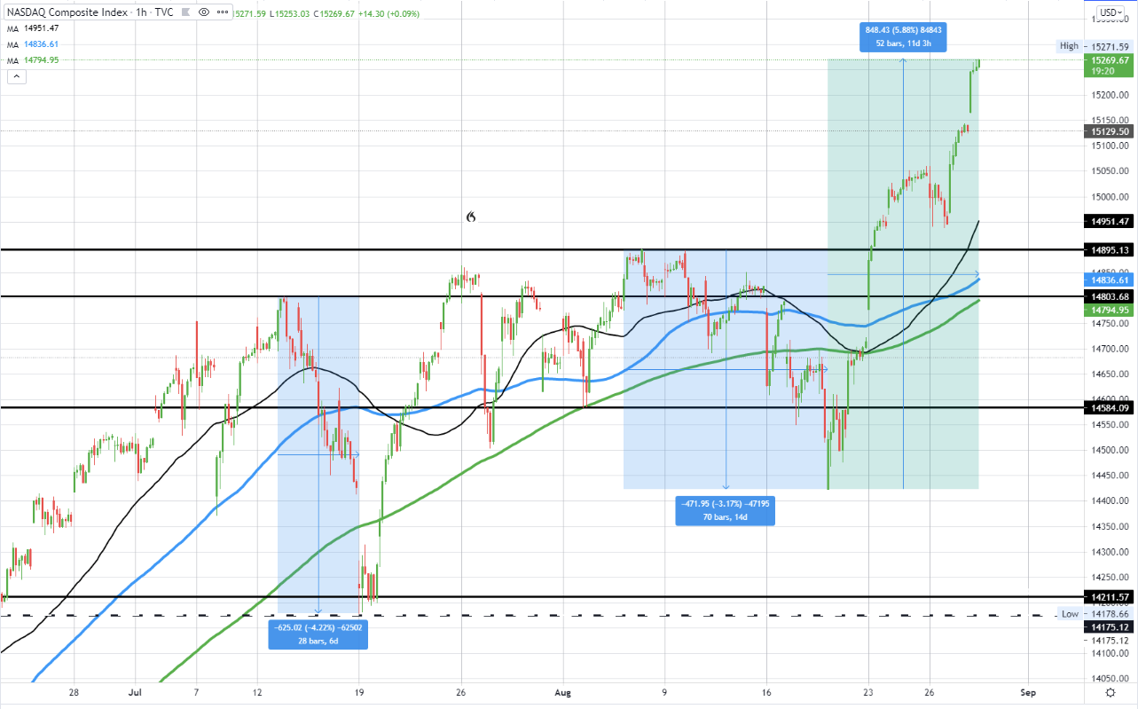 the NASDAQ index has just reached a new intraday high (taking out the reviews high of 15270.20). The index is up over 141 points or 0.94% on the day.  The index is trading at yet another all-time new high. A close higher today would be the 32nd close higher for the index