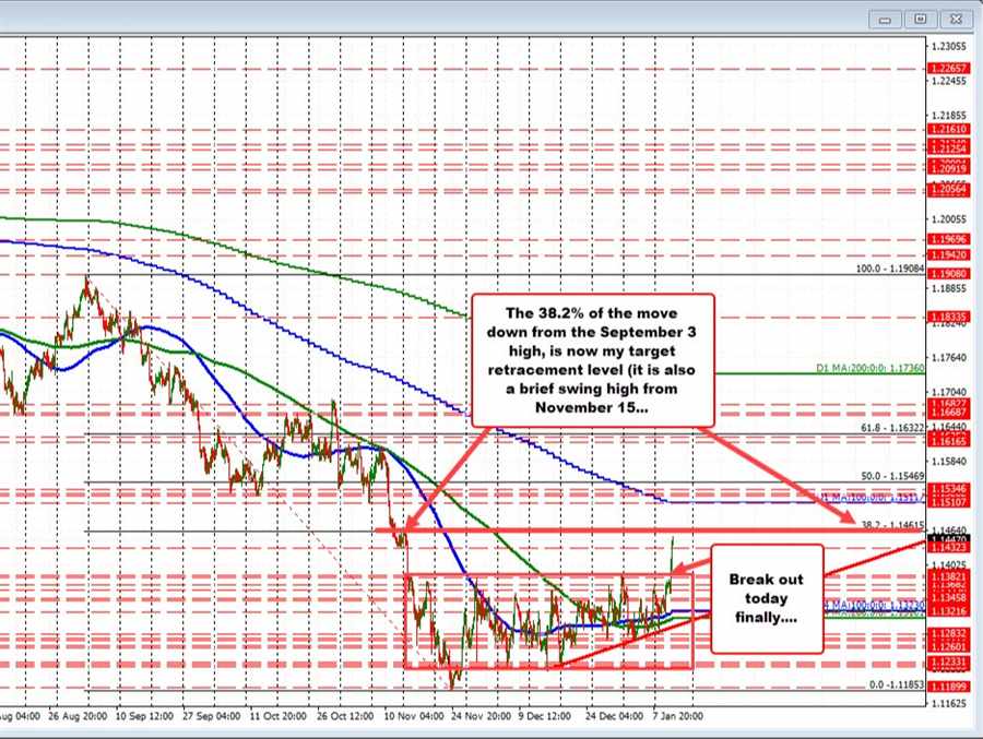 In an earlier post(s), I was targeting the 50% of the move down from the October 28 high. That was the corrective high from that day and started the sharp move to the downside that bottomed on November 24th. The midpoint was at 1.14385 (see last post here). The price has reached that target and is now above it, rising to a new high at 1.14521