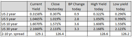 The US yields have not been influenced in a negative way by the lower nonfarm payroll data.  Nuances in the number and higher wages may be the counterbalance, along with expectations for a rebound next month.  The 10 year yield is up 3.6 basis points at 1.607%.  The five year yield is comfortably above 1.0% at 1.0465%.  Note also that the treasury will auction off three, 10, and 30 year issues next week. There may be some concessions being price down before those auctions.