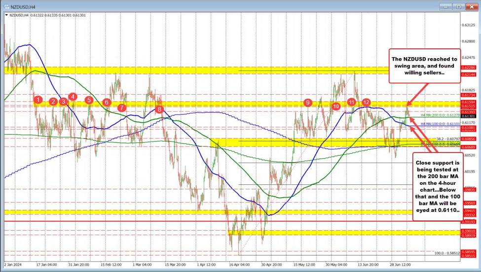 Today, the price extended to the highest level since June 14th and in the process moved into a swing area target between 0.6151 to 0.6159. Sellers leaned in the Asian session and rotated lower. The low price has reached back to the 200-bar MA on the 4-hour at 0.61278.