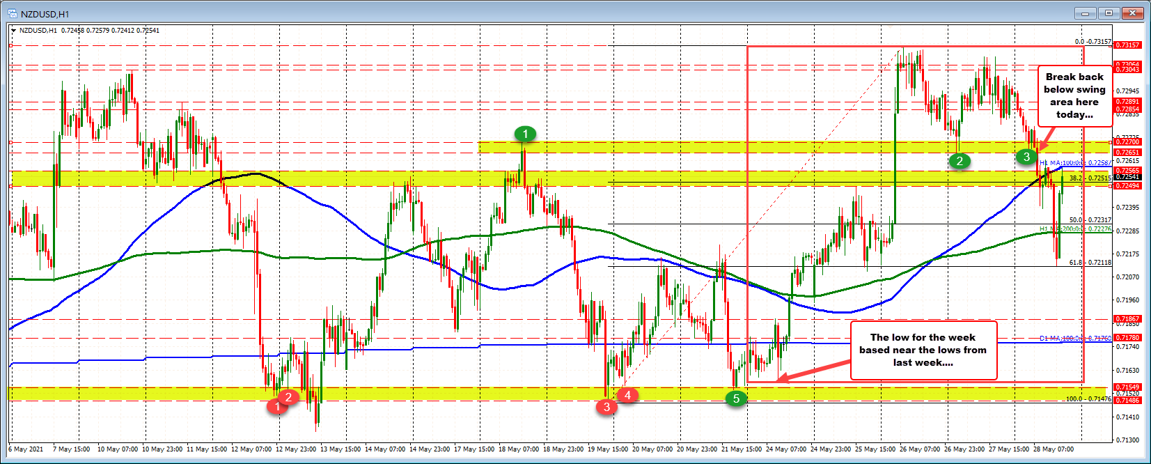 Today, the buyers turned sellers, the pair fell below the low from Thursday and you down through the 100 hour moving average, 200 hour MA, but stall at the 61.8% retracement of the move up from the May 19 low at 0.72118.