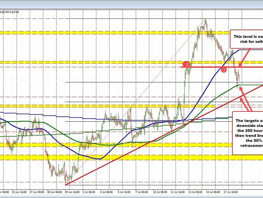 Technically, the price moved briefly below it to 100-hour moving average of 0.62668 (green line in the chart below). However, that break was short-lived and the price rotated back to the upside. The balance has taken the price back toward a swing area near 0.63055. If sellers can keep a lid on the pair against that level, a rotation back toward the 200-hour moving average would be anticipated.