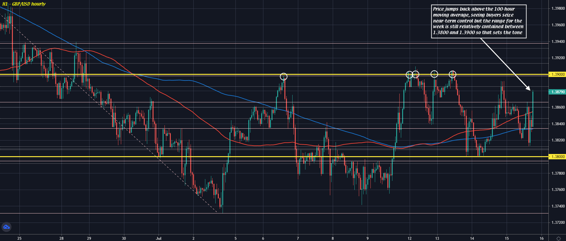 That has seen cable come to life in a move from 1.3840 to a session high of 1.3884 as buyers also push for a move above the 100-hour moving average (red line):