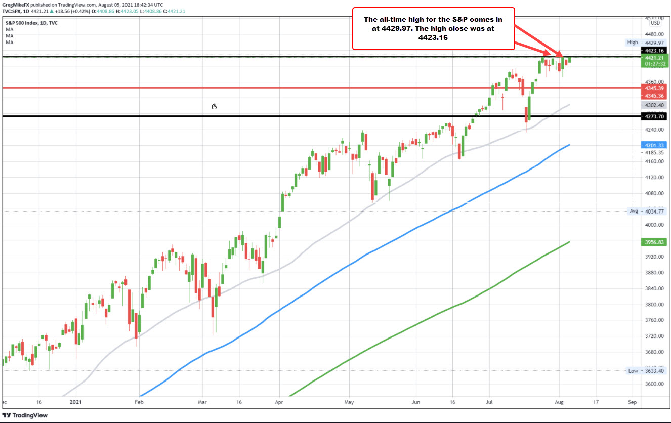 The S&P index is higher by about 17 points out 4419.60. The high price for the day reached 4423.05. That level came in just short of the all-time high close from Tuesday at 4423.16. The intraday all-time high price comes in at 4429.97.