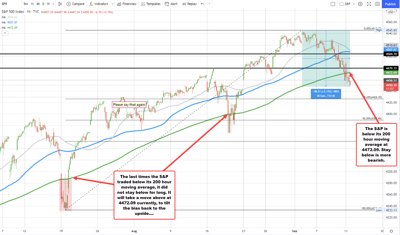 It will take a move back above the 200 hour moving average to tilt the bias more to the upside again. Until then, there could be more downside probing with the 38.2% retracement of the move up from the August 19 low coming in at 4426.39.