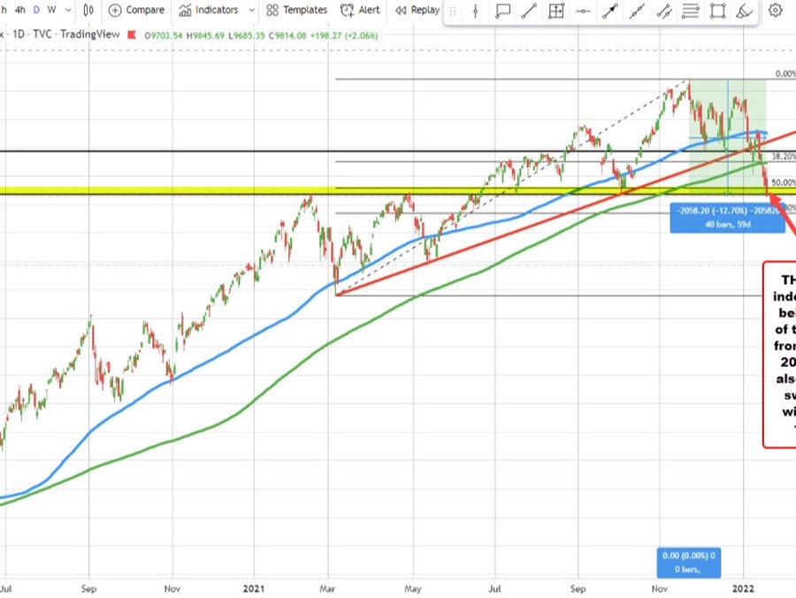 • The NASDAQ index is closing below its 200 day moving average for the third day in a row. And is also closing below a swing low area and 50% retracement between 14154 and 14181 (see chart below)