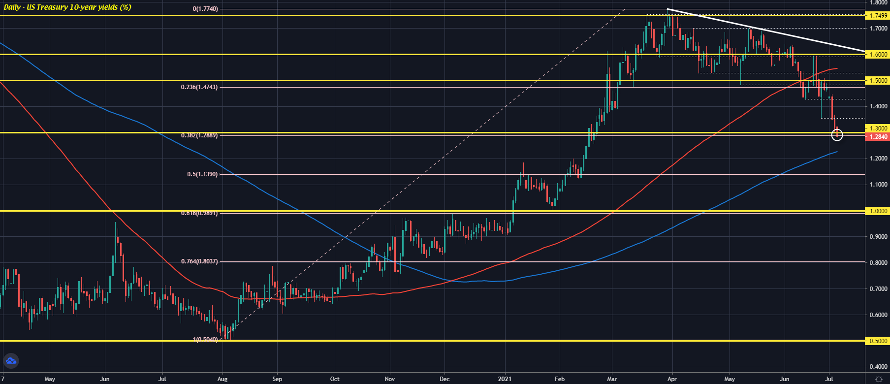 The bond market continues to flash a warning sign to the rest of the market as we now see 10-year yields sink below 1.30% to its lowest since February.