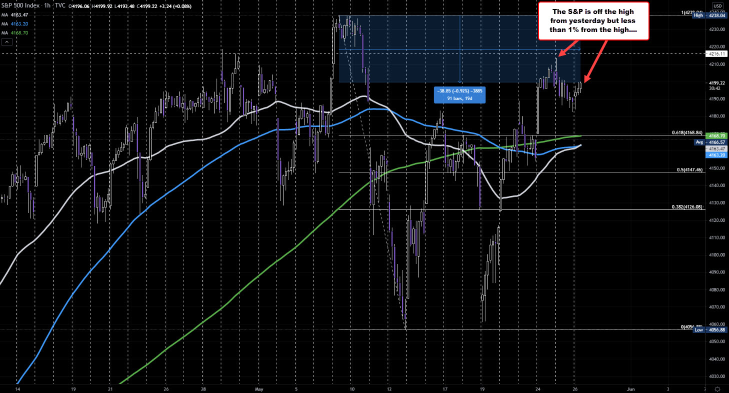 The S&P index is off the high from yesterday, but is still less than 1% from its all time high at 4238.04