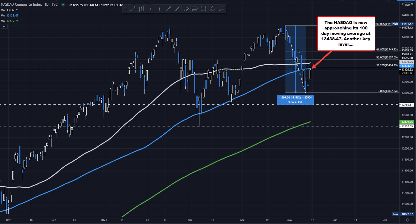 The NASDAQ index continues its move to the upside and is currently trading up over 300 points or 2.3% at 13428.03 (that is the high). The last move to the upside took the price back above its 50 hour moving average currently at 13407. The next target comes in at the 100 day moving average which is at 13438.47 currently.