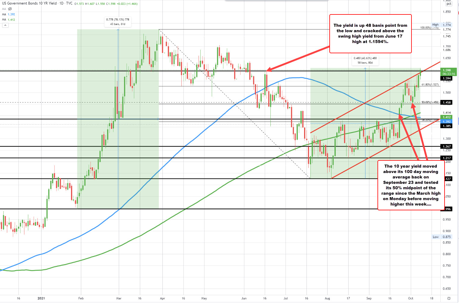 The 10 year yield has moved above the 1.600% level for the first time since June 4. The move higher pushed above the June 17 high of 1.594%. It also moved above a Topside channel trendline near 1.584%.