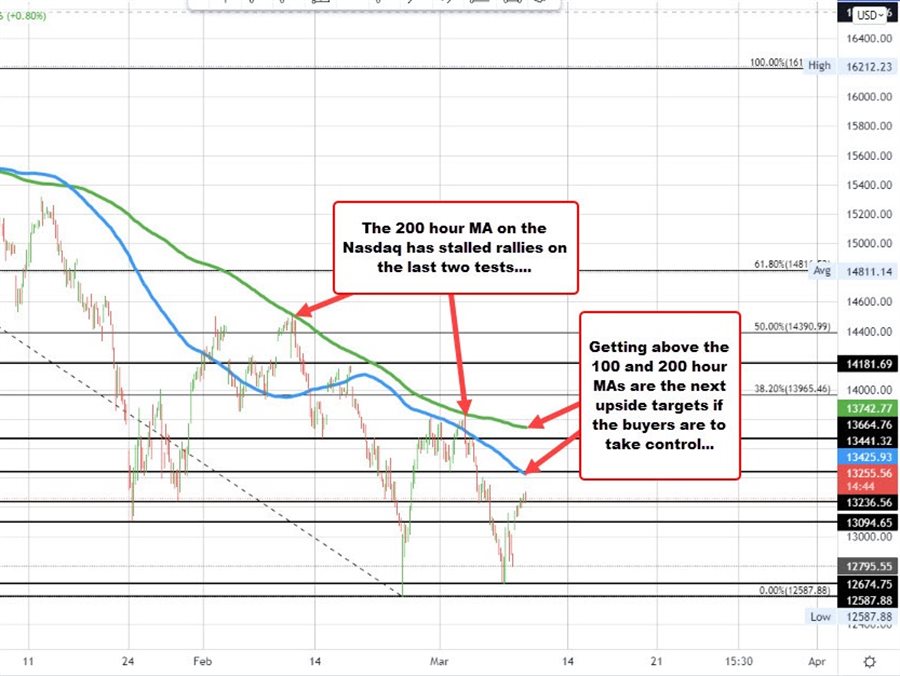 Technically, looking at the Nasdaq index, the pairs low yesterday was able to stay above the cycle intraday low at 12587.88 (the low yesterday reached 12674.75). However, the price remains below the 100 hour MA at 13425 and the 200 hour MA at 13742.77. The last two tests of the 200 hour MA stalled the rallies. As a result, technically that MA remains a key target to get to and through if the pair is move higher.