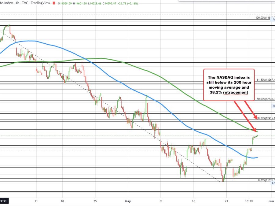 Looking at the Dow chart below, it too moved above its 200 hour moving average at 32833.04 (green line in the chart below). The price yesterday extended above the 38.2% retracement at 32490.93. The next target comes against the 50% midpoint at 33063.99. Like the S&P stay above the 200 hour moving average keeps the buyers in control.