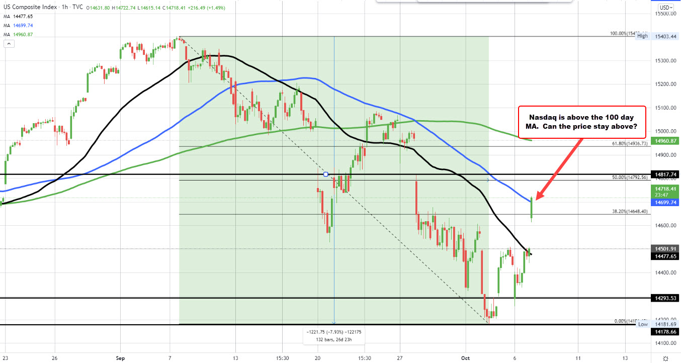 The NASDAQ index is up 1.55% at 14728.30. In the process the price has moved back above its 100 day moving average at 14699.74 (blue line in the chart below.  Stay above would have traders targeting the 50% midpoint of the move down from the September high which comes in at 14792.56.