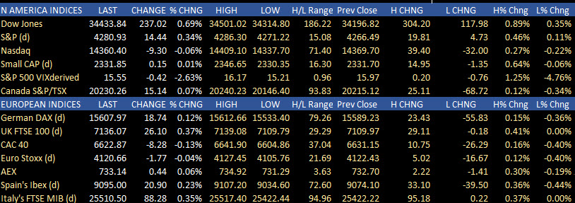 • Dow gained 238.67 points or 0.7% at 34435.49