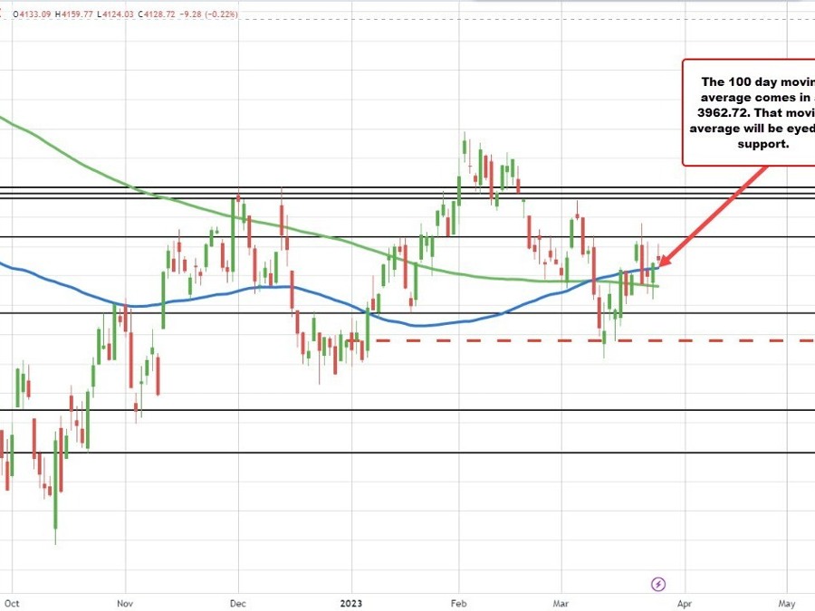 The S&P index moved above the 4000 level intraday to a high of 4003.83, but could not maintain the upward momentum. On the downside, the 100 day moving average comes in at 3962.72. The low price today reached 3970.49.
