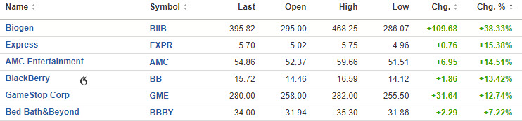 Meme stocks and Biogen were leaders today with Biogen rising 38.33% after the FDA approved and Alzheimer’s drug. The other beginners were familiar meme stocks including Express, AMC, Blackberry, Gamestop, Bed Bath and Beyond.