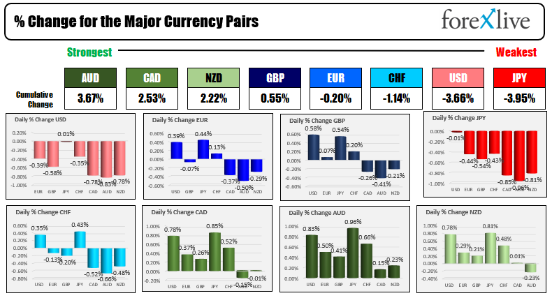 In the forex, the AUD remains the strongest and the JPY is the weakest. The USD has moved lower since the start of the North American session. The USDJPY is back to unchanged on the day after being up about 0.29% at the start of the New York session. The USDCHF has moved to the downside after being near unchanged (it is down -0.35% now).