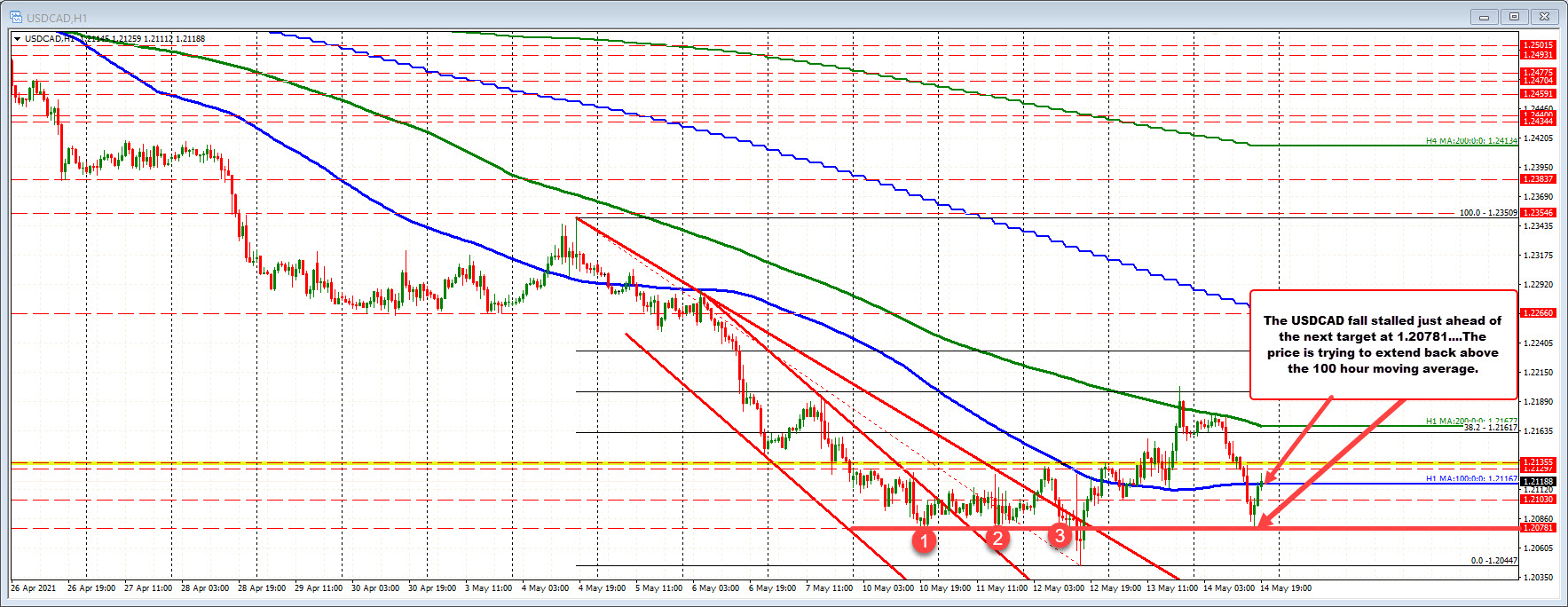 The USDCAD moved below the 100 hour MA at 1.21167 after the US retail sales and the better than expected wholesale sales from Canada. The next downside target at the time was at 1.20781. That was home to swing lows from May 10, May 11 and May 12 before breaking to the weeks low also on May 12.