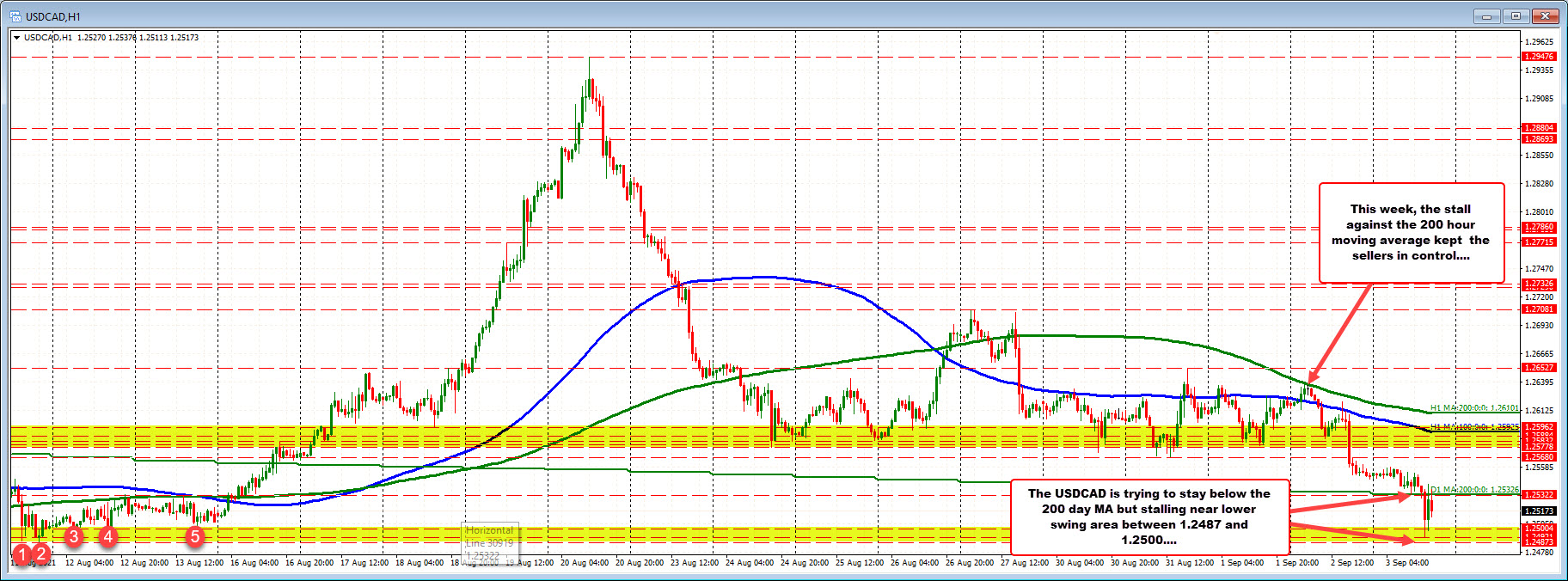 The USDCAD yesterday moved up to test its falling 200 hour moving average (green line). Sellers leaned against that level and in doing so kept the sellers in control. The price ultimately fell below the recent swing lows down to 1.2568.