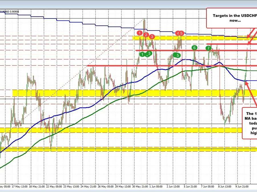 The USDCHF is up about 0.66% today, trading in the current hourly bar to a new session high at 0.91013. The moves is short of the high from Wednesday and Thursday near 0.91069 and also the important 100-day MA at 0.91173. The price did move above the 100-day MA back on May 31, but could not sustain momentum above that MA level. That MA was retested on June 5th but found willing sellers against the level.