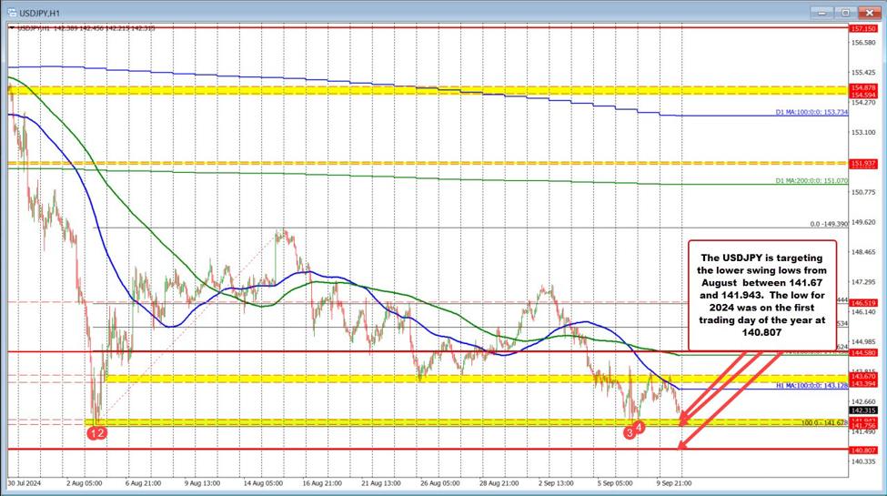 Technically, the price high today stalled near the high of a swing area at 143.67 (the high reached 143.70). The price moved back below its 100-hour moving average (blue line currently at 143.128 and moving lower). That is now a risk level for shorts looking for more downside momentum. A move back above the 100-hour MA would disappoint the sellers in the short term at least.