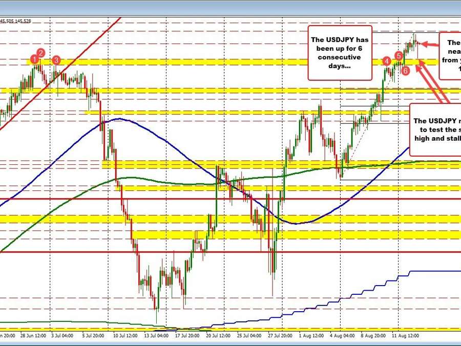 The price has rebounded back toward the close from yesterday at 145.54. Of significance is that the price of the USDJPY has been up for 6 consecutive days. During that time the price has moved up from 141.50 up to a high of 145.859. The closing level should be a barometer for bullish above/bearish below. With a price and trading right around the level, buyers and sellers are currently battling it out for intraday/short-term control.