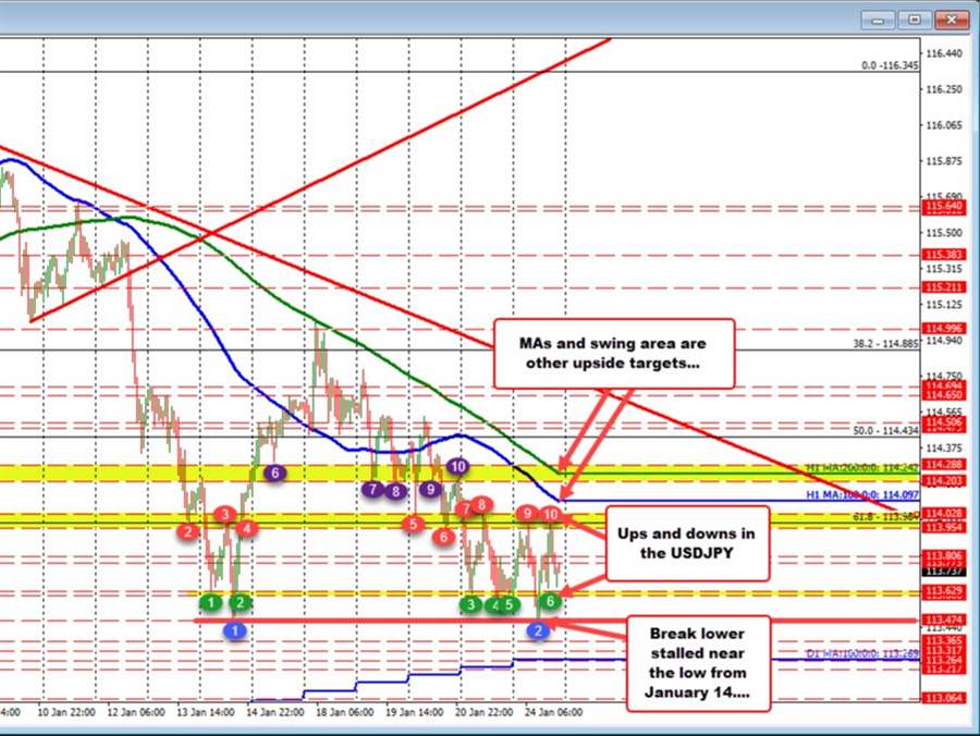 The USDJPY has seen more up and down price action today continuing the price action seen on Friday. The pair did move below the low from Friday’s trade, but found support near the low from January 14 at 113.474. It dipped briefly below the level to a low of 113.464, but quickly rebounded.