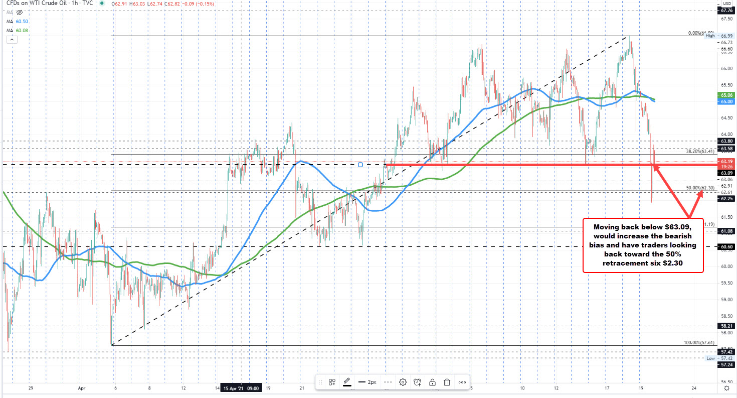 Looking at the hourly chart, the tumble lower to the price for a brief moment below the 50% retracement of the move up from the April 5th low at $62.30. The subsequent rally took the price back above the lows from last week at $63.09. The current price is trading just above that level at $63.21 after the settlement. A move below $63.09 should increase the bearish bias