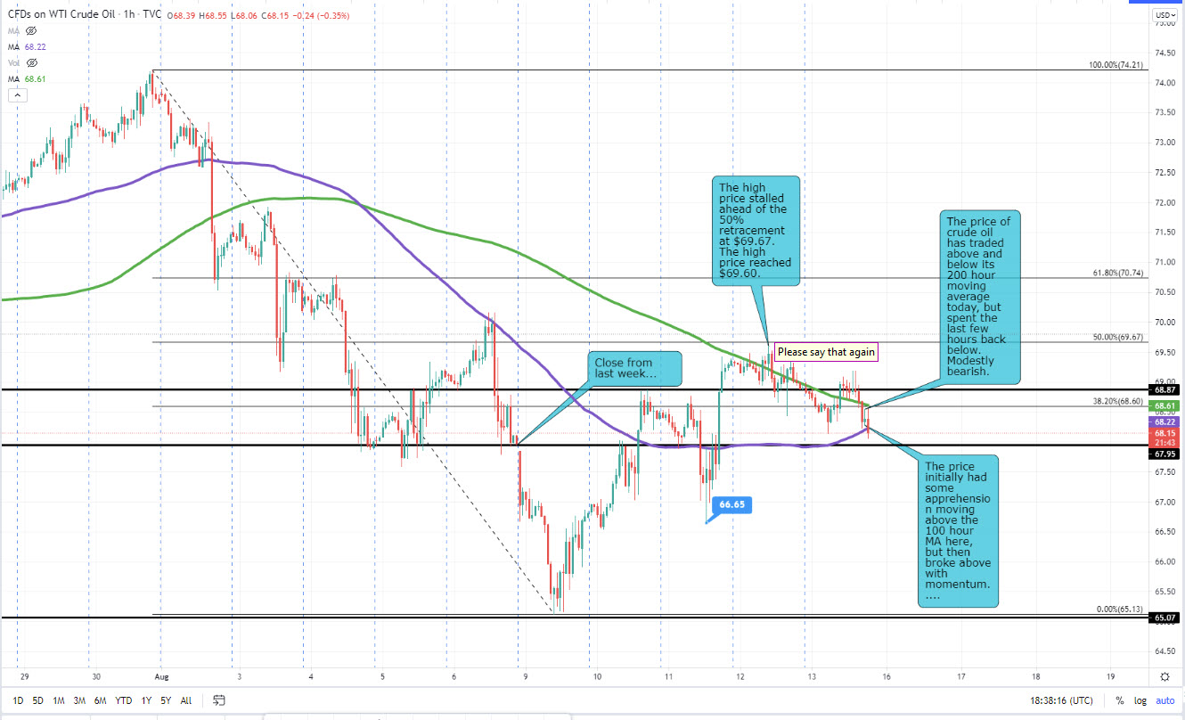The pair traded above and below its 200 hour moving average yesterday and today. At the low today, the price did dipped below the 100 hour moving average currently at $68.22, but rebounded into the settlement. The price trades between its 200 hour moving average above at $68.61, and the 100 hour moving average below at $68.22.