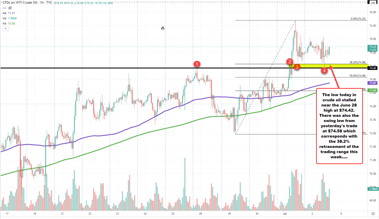 That area between $74.42 and $74.58 is support going forward. A move below would have traders looking toward the 50% retracement at $74.08 and then the rising 100 hour moving average at $73.87.